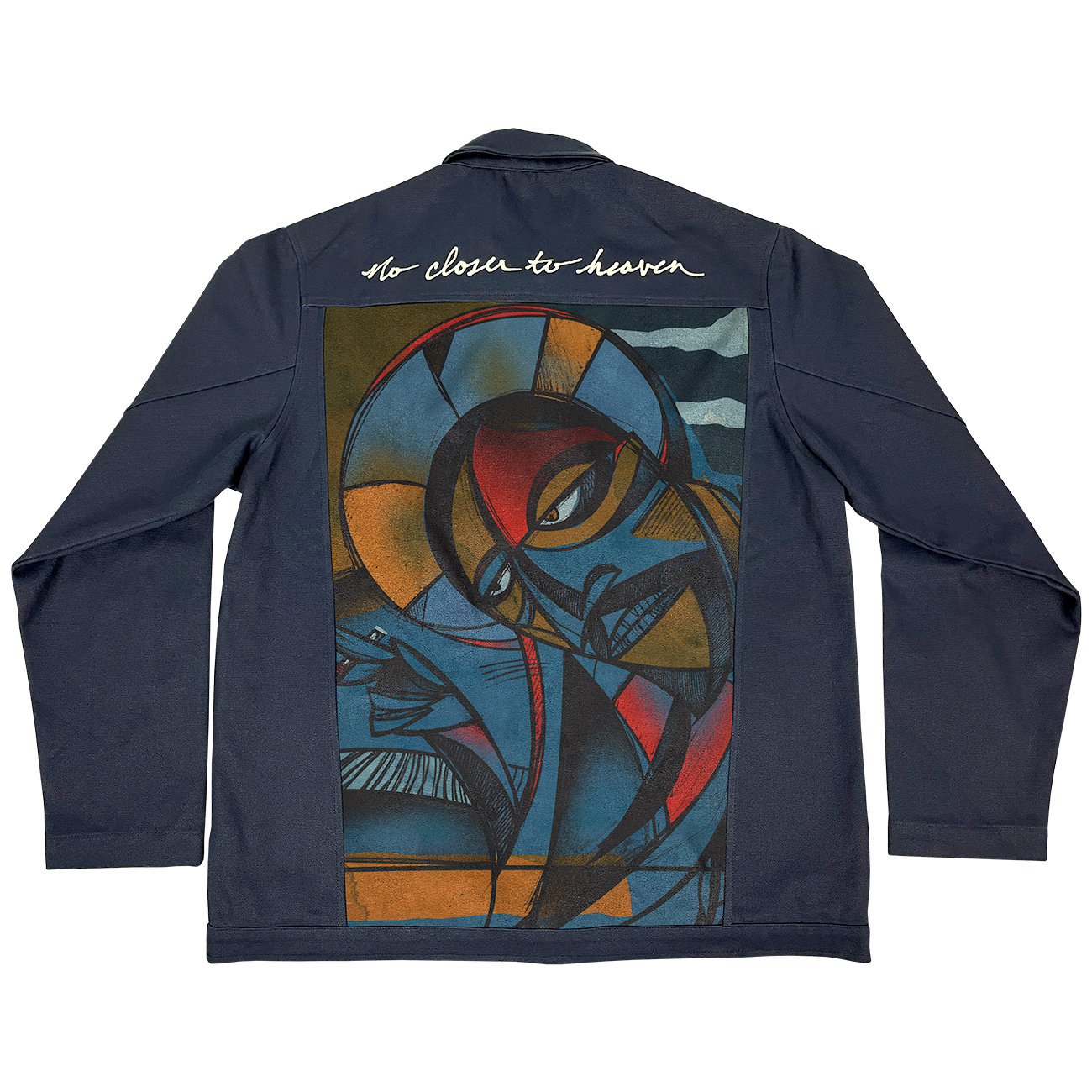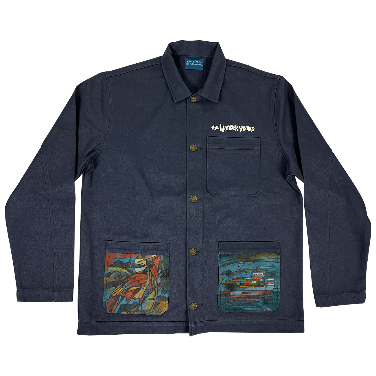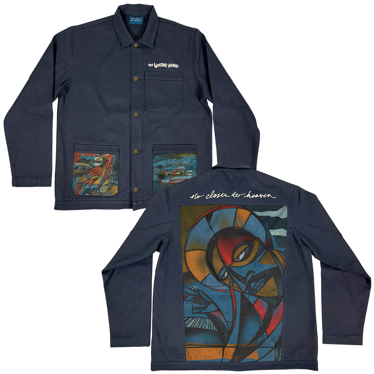 Limited edition 100% Heavy Cotton Duck Canvas, cut and sew chore coat with “Antique Gold” TWY Monogram YKK Brass Buttons. The jacket utilizes artwork from the bands 5th studio album " No Closer To Heaven” on an oversized printed back panel and front pockets.